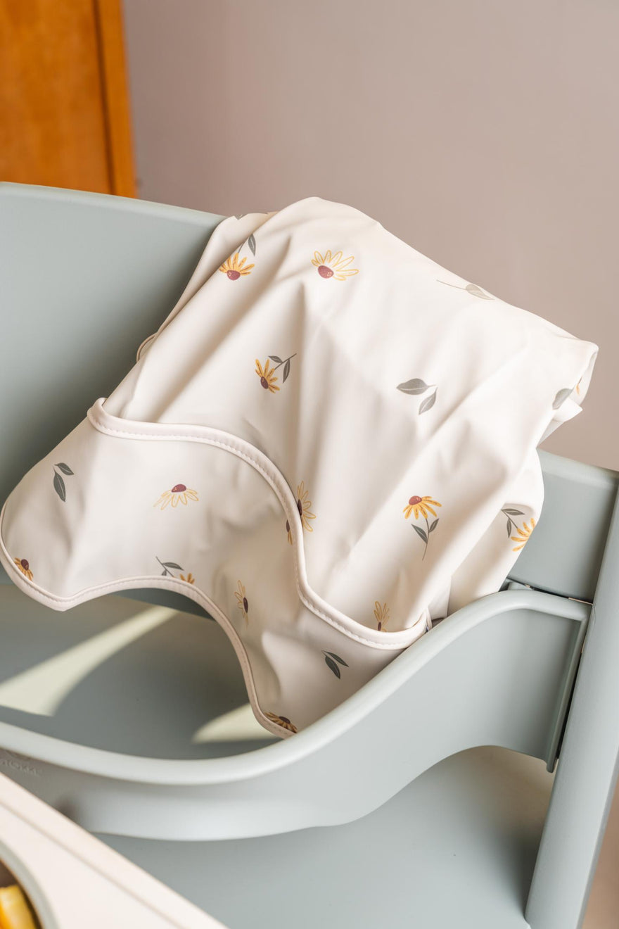 Water-repellent bibs materials that are easy to clean. Choose from full-coverage bibs with sleeves or bibs without sleeves. Our bibs are made of gentle and flexible material that is both easy to rinse and dry after use. They are also machine washable. Our full-coverage bib with sleeves is perfect for protecting clothes completely from stains, while our bib without sleeves is easy to take with you in your bag when you are on the go.