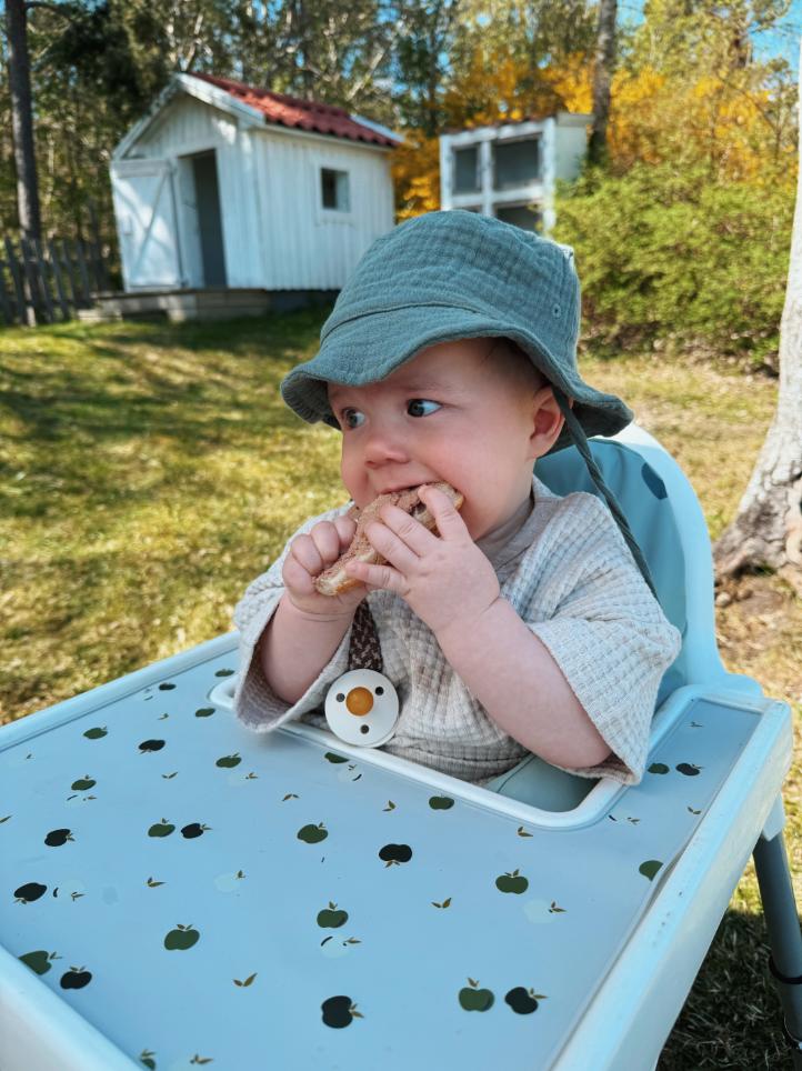 En 6-månaders kommer inte äta sig mätt vid första måltiden, kanske inte ens stoppa något i munnen. Den första tiden handlar mer om att lukta, känna, kasta, mosa. Låt din bebis får bekanta sig med maten med alla sinnen – i sin takt. Och fortsätt med ersättning/amning.