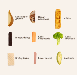 Tänk på att erbjuda livsmedel som är hyfsat mjuka men lätta att greppa. Tex stavar av sötpotatis, stänger med skivbar leverpastej, kokt broccoli eller omelett/pannkaka i remsor. Även smörgåsrån med smör och/eller leverpastej är perfekt för att öva motorik. Hala livsmedel som är svåra att greppa kan man rulla i frön eller smörgåsrånkross. Exempelvis avokado eller banan. Men generellt sätt är det bra att erbjuda bebisen det som resten av familjen äter så ofta som det går.
